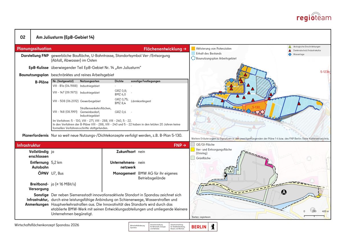 Im Wirtschaftsflächenkonzept Spandau werden alle in der Flächenkulisse enthaltenen Gewerbegebiete in Form von Standortpässen mit Eckdaten, Entwicklungsmöglichkeiten und Handlungsbedarfen dargestellt. Nachfolgend ist als Beispiel der Standort "Am Juliusturm" abgebildet (klick zum vergrößern):