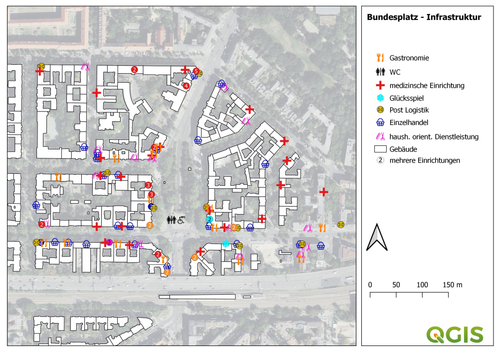 Und so zeigt Ludwigs Bundesplatz-Karte verschiedene - zumeist gewerbliche - Nutzungen am und um den Bundesplatz. Diese hat er zunächst am Computer per "Desktop-Recherche" erfasst und später zu Fuß, per "Sichterfassung" mit Kamera und Notizblock um weitere Nutzungen ergänzt. Erstaunlich, wie viele kleine Läden auch bis heute noch nicht auf Google zu finden sind! Alle aufgenommenen Daten wurden dann in einem Geographischen Informationssystem (GIS) in Tabellen sortiert und geographisch verortet. In Kombination mit anderen Kartendaten, zum Beispiel einem Luftbild der Umgebung oder den Häusergrundrissen des Viertels hat Ludwig am Ende eine Nutzungskarte erstellt - komplett mit Legende, Maßstabsleiste und Nordpfeil.